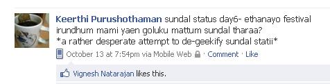 Bwahahaha, get it?! The book was full of such translations. There was this section presumably on how to improve relations at office. It asked me to ask "வாழ்க்கை எப்படி சென்று கொண்டிருக்கிறது?" to all my colleagues. No, really. I laughed like a maniac. I started imagining how facebook would be if all our conversations were in femina tamizh.